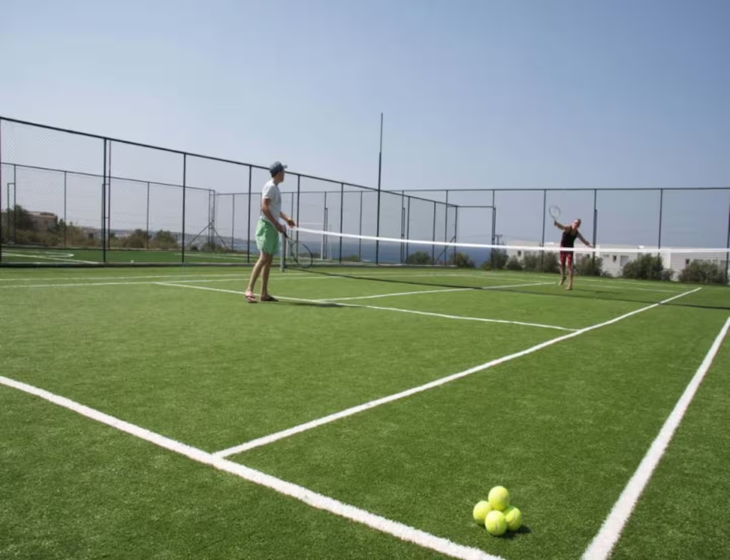 The complex offers free Wi-Fi in all common areas, a shared swimming pool, a children’s playground, and a tennis court, as well as a bar – restaurant – traditional taverna. There is also free shuttle transportation within the complex for added convenience.