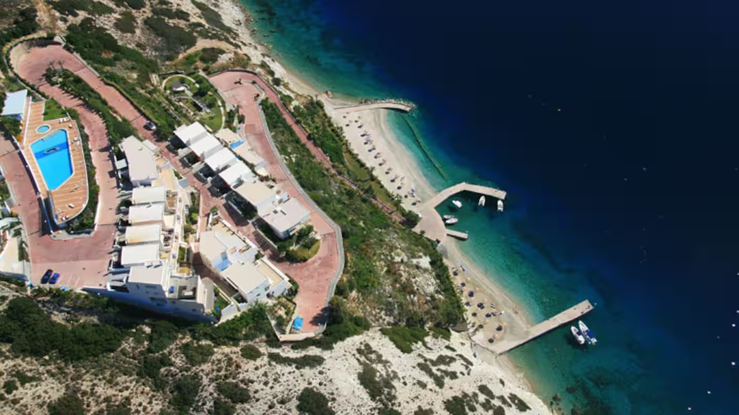 The location is particularly convenient, very close to the highway, with nearby villages offering supermarkets, bakeries, grocery stores, and butcher shops. It is also close to the beaches of Agia Pelagia and Lygaria, known for their crystal-clear turquoise waters.